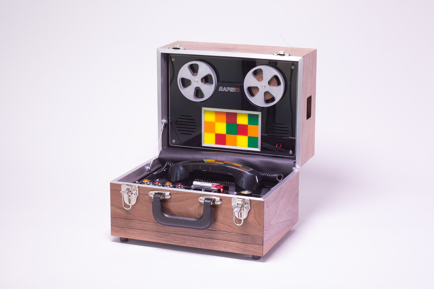 When the recipient opens the box and powers it on, a built in speaker rings, accompanied with a blinking incoming call light, prompting the individual to lift the telephone handset. A reel-to-reel tape deck spins up and blinking lights illuminate with a customizable audio recording walking the listener through the printed materials enclosed in a drawer.